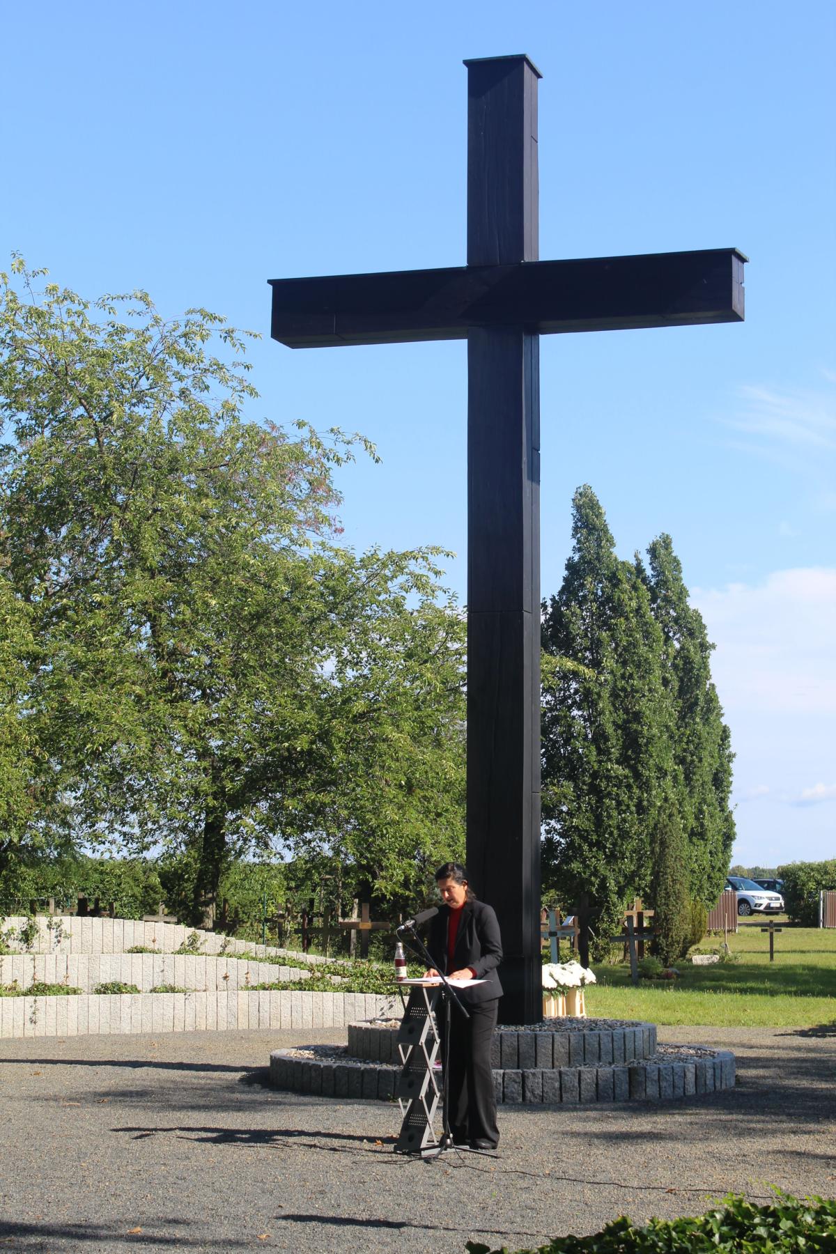 Mit den Klängen der Friedhofsglocke endete die Zeremonie auf dem Soldatenfriedhof. Im Anschluss daran wurde die Gedenkveranstaltung am Hochkreuz im Lager Mühlberg fortgesetzt. Die Gedenkrede hielt Frau Dr. Nancy Aris als Landesbeauftragte für die Aufarbeitung der SED-Diktatur im Land Sachsen. Die musikalische Begleitung geschah durch den Posaunenchor Mühlberg. Nach den Kranzniederlegungen durch Land, Kommunen und Vereine wurde die Veranstaltung in der Mühlberger Klosterkirche ergänzt.