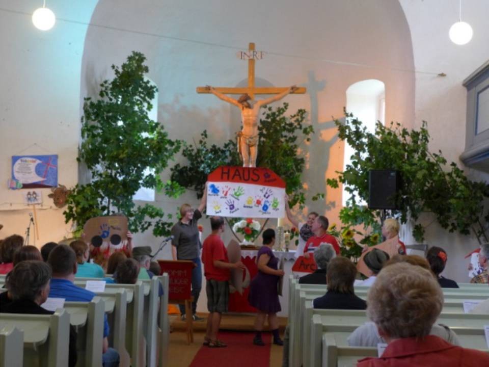 In jedem Durchgang werden an zwei Sonntagen Gottesdienste gemeinsam gestaltet. Dafür werden Kulissen gebastelt und Anspiele eingeübt. Viele unserer Teilnehmer genießen es, an der Vorbereitung und Durchführung aktiv mitzuwirken. Diese Sonntage sind auch immer ein Höhepunkt. Anschließend geht es gemeinsam mit den Gästen zu Kaffee und Kuchen. Ein besonderer Sonntag ist unser Diakonischer Nachmittag, zu dem viele Gäste kommen und die Kirche voll besetzt ist. Hier treffen sich Menschen, die uns unterstützen und begleiten, aber auch ehemalige Mitarbeiter, die obwohl sie nicht mehr aktiv mitarbeiten, doch immer noch mit uns verbunden sind. Da verwandelt sich der Hof oder die Wiese hinter der Kirche in eine große Kaffeetafel. Besonders wichtig ist uns dabei der Festgottesdienst, zu dem wir uns besondere Gastprediger einladen. Unserer Einladung sind dabei schon Bischöfe, Pröpste, aber auch solche Persönlichkeiten wie Bernd Siggelkow von der Arche Berlin gefolgt, die uns und unsere Gäste mit ihren Berichten und Predigten sehr beeindruckt haben. Begleitet werden wir dabei von Posaunen- und Kirchenchören der Region, die diesen Nachmittag musikalisch abrunden.