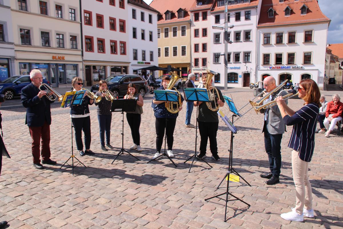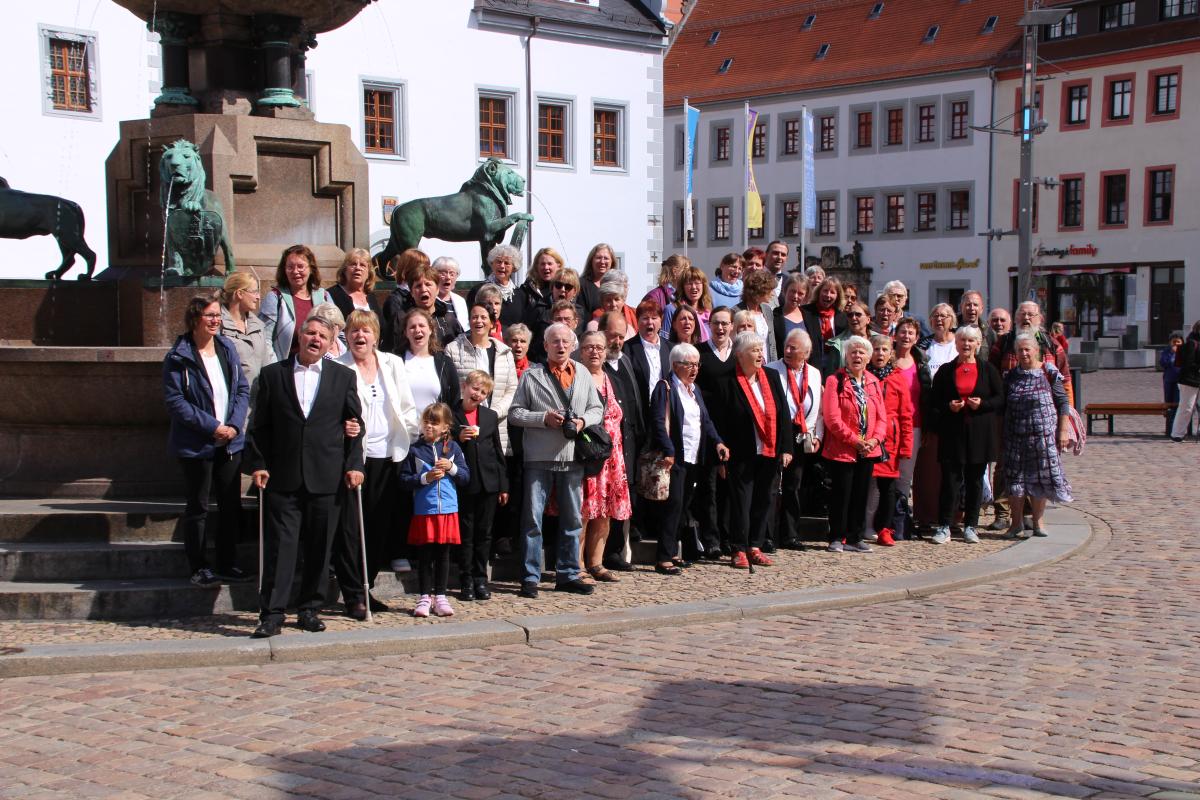 Unter den Mitreisenden war auch der Mühlberger Posaunenchor, der der Kantorei bei dieser Gelegenheit mit einem zweiteiligen Ständchen sowohl im Dom, als auch auf dem Obermarkt gratulierte.